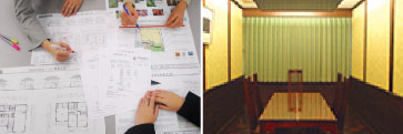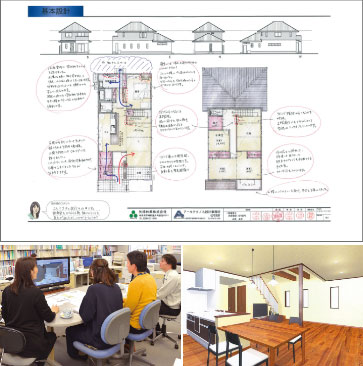 ■ プランニング・基本設計弊社のアーキテクノス設計事務所で、敷地の形や採光、建物の強度などをしっかり考慮され、要望の入ったプランが出来上がりました。この初期プランを基に打ち合わせを重ねました。シミュレーション体験をして、空間のイメージをパースで見て確認しました。 主婦・子育てなど経験豊富な女性設計士によるプランニングなので、女性目線の住みやすい工夫も提案していただきました。