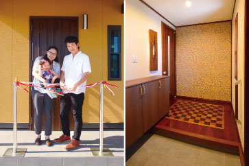 ■ 引渡式ついに家が完成!感動のテープカットを行いました。玄関に入ると市松模様のフローリングとウィリアム・モリスの壁紙が出迎え、お気に入りの空間です。