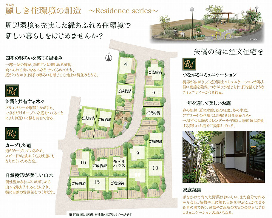 「心豊かな暮らし」への第一歩は、安心・安全、かつ美しい風景があり、 ここなら住んでみたいと思っていただけるような場所を創造することです。 遠くから我が家を見ると、緑の木々に囲まれた一つの邸宅(Residence)のように見える街。そこにお住まいになる方々は「心豊かなコミュニティー」が自然と醸成されていく、そんな「麗しき住環境」を提供していきたいと考えております。