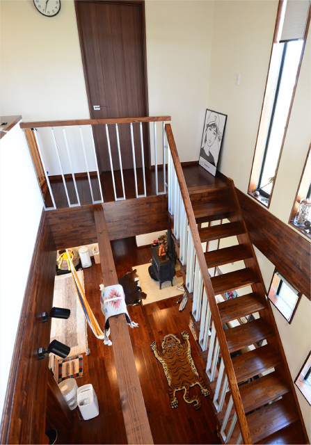 家は1階にリビングと水回り、2階にダイニング・キッチンとなっています。食事と寛ぐ時間の区切りがつけやすく、それぞれの時間に集中できる。家具や、部屋を彩るもののひとつひとつから、良いものを選んで長く大切に使いたいというご主人の思いが感じられます。「2年住んで、愛着が沸いています。掃除をしながら、この家に住めて幸せだなあとしみじみ感じた」とご主人が話してくれました。火を身近に感じられる薪ストーブ、陽の光が入る窓。空間を繋げる吹き抜けや、木の温もりを感じる造作材など…家を構成する様々な要素が、ご家族の暮らしへのこだわりを、おおらかに受け止めていました。好きなものや、それぞれのこだわりを大切に、尊重し合いながら共に楽しむ暮らし。感性が刺激されるこの家で、お子様が心豊かに、のびのびと育つ様子が目に浮かんできました。